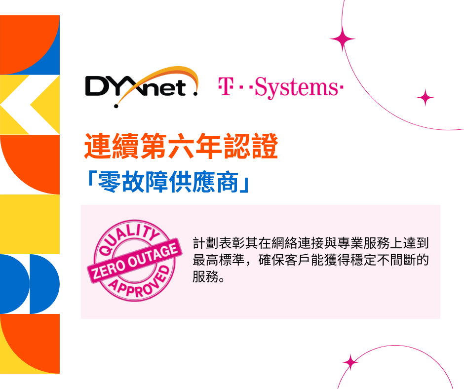 衷心感謝T-Systems International連續第六年認證第一線為「零故障供應商」!這持續的肯定反映了我們團隊對提供高質網絡解決方案的努力。