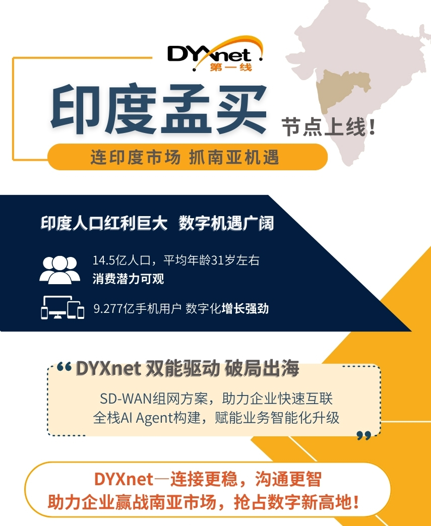 iPhone 17 在印度热卖所折射的制造升级与市场潜力,正是中企出海的重要窗口期。而网络基建的通畅与 AI 技术的本地化落地,恰是把握机遇的关键支撑。从POP节点破除网络壁垒到AI Agent适配本地需求,第一线DYXnet的实践印证了技术服务对产业出海的赋能价值。在制造与 AI 深度融合的出海新阶段,这类 “基建 + 智能” 的协同方案,正成为企业打通全球供应链、扎根海外市场的重要助力。